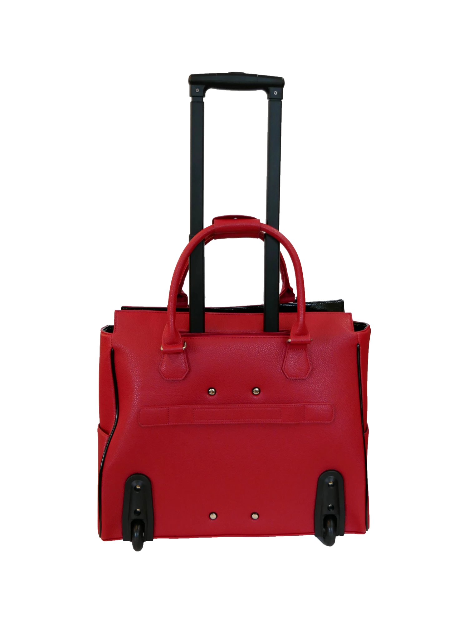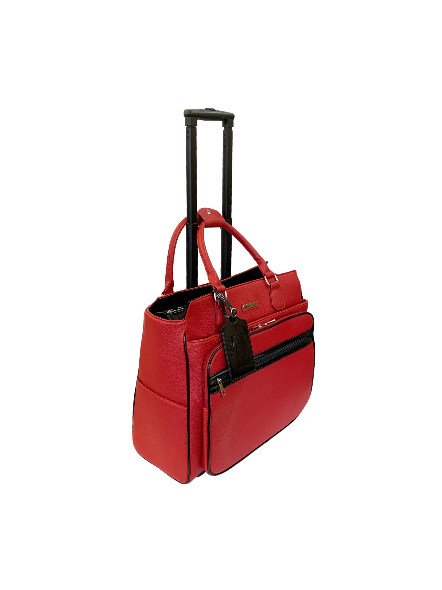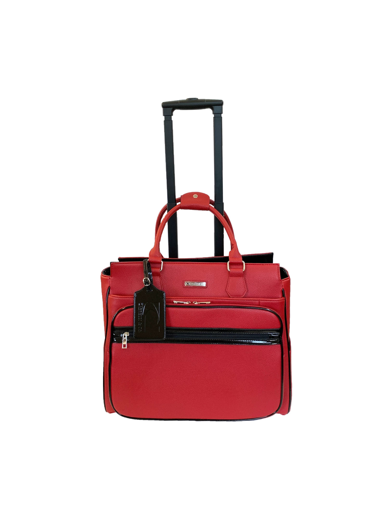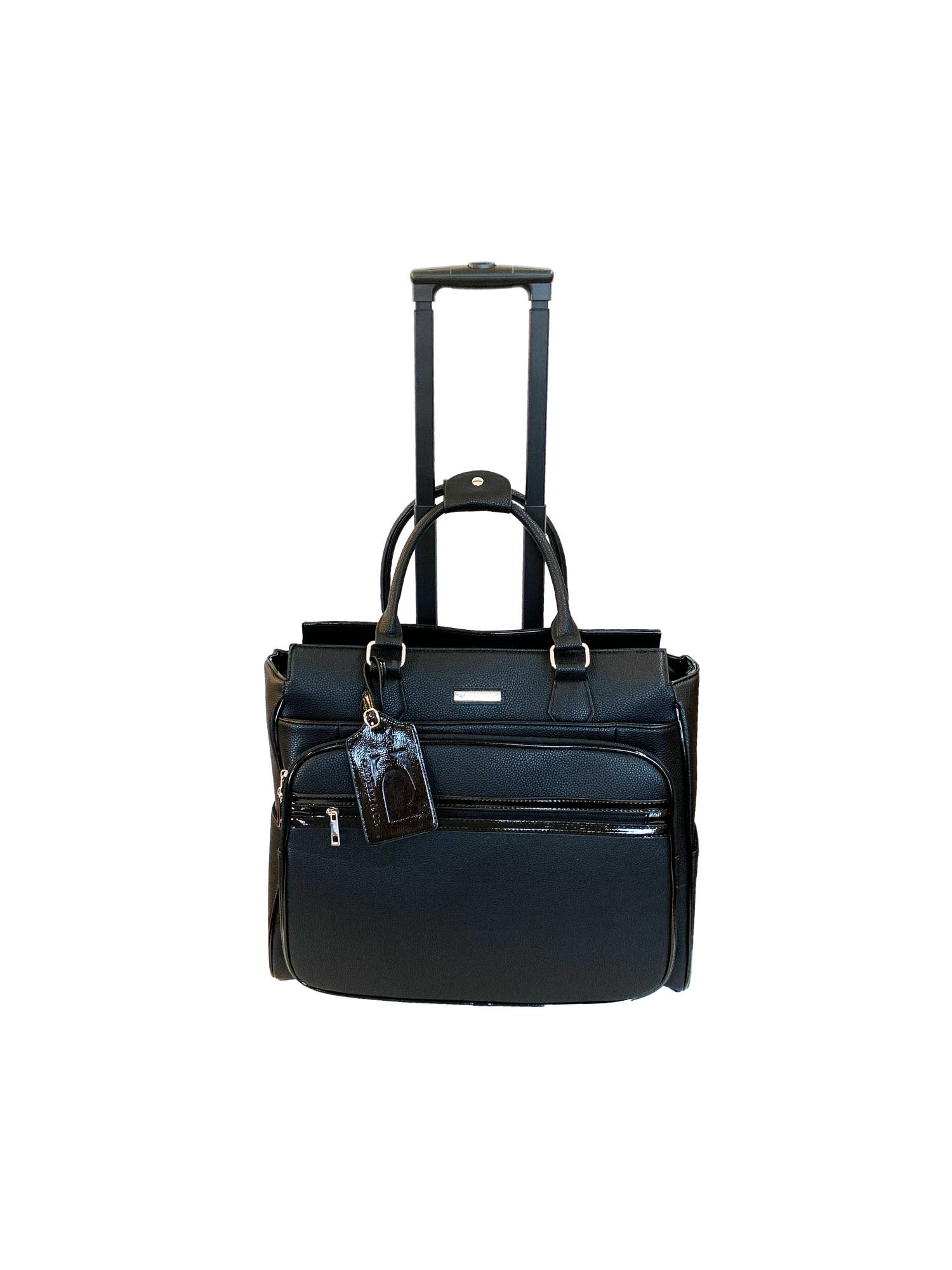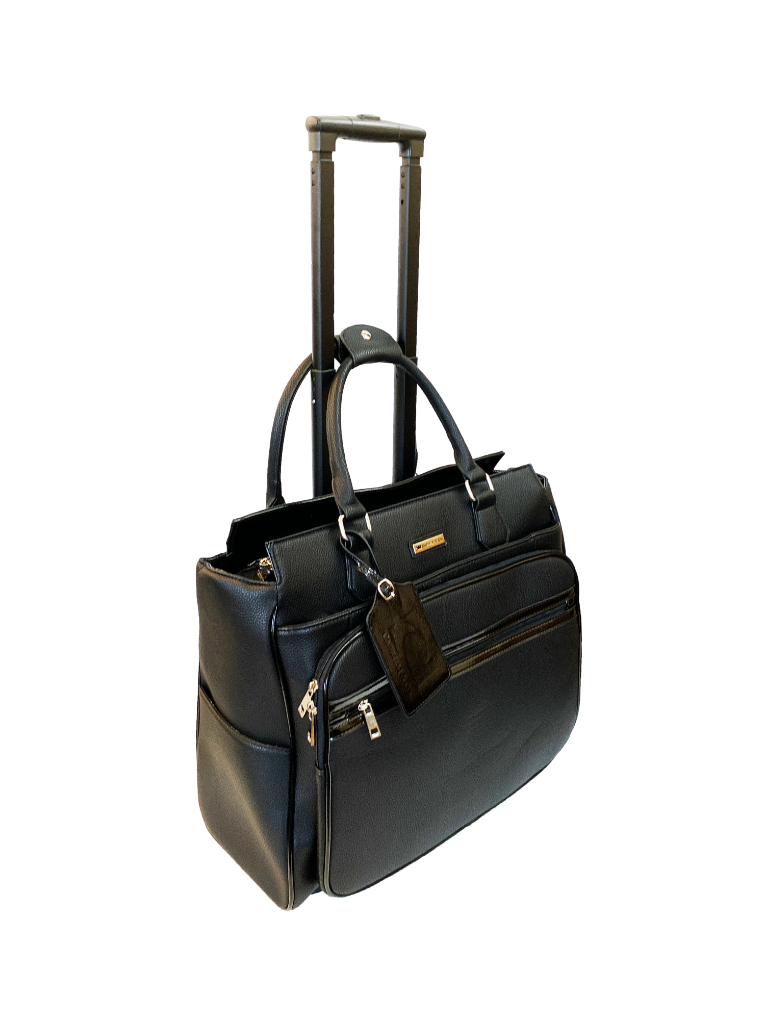 This airplane carry on size executive rollerbrief, a nylon faux leather detailing beauty with front zipper pocket, is fitted for the working, travelling woman who appreciates the smart and unconventional, and features a retractable handle, two roller blade wheels, padded compartments for a 15″ laptop and an electronic tablet/reader, two top zip compartments and much more.