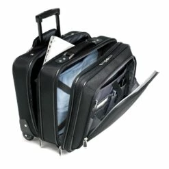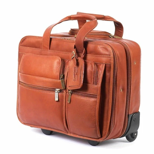 The Claire Chase Rolling Computer Brief in Assorted Colors features a leather construction with antique brass hardware and an extra long retractable handle. Two zippered compartments hold files and a laptop. In-line skate wheels and a trolley strap make transportation simple and convenient.