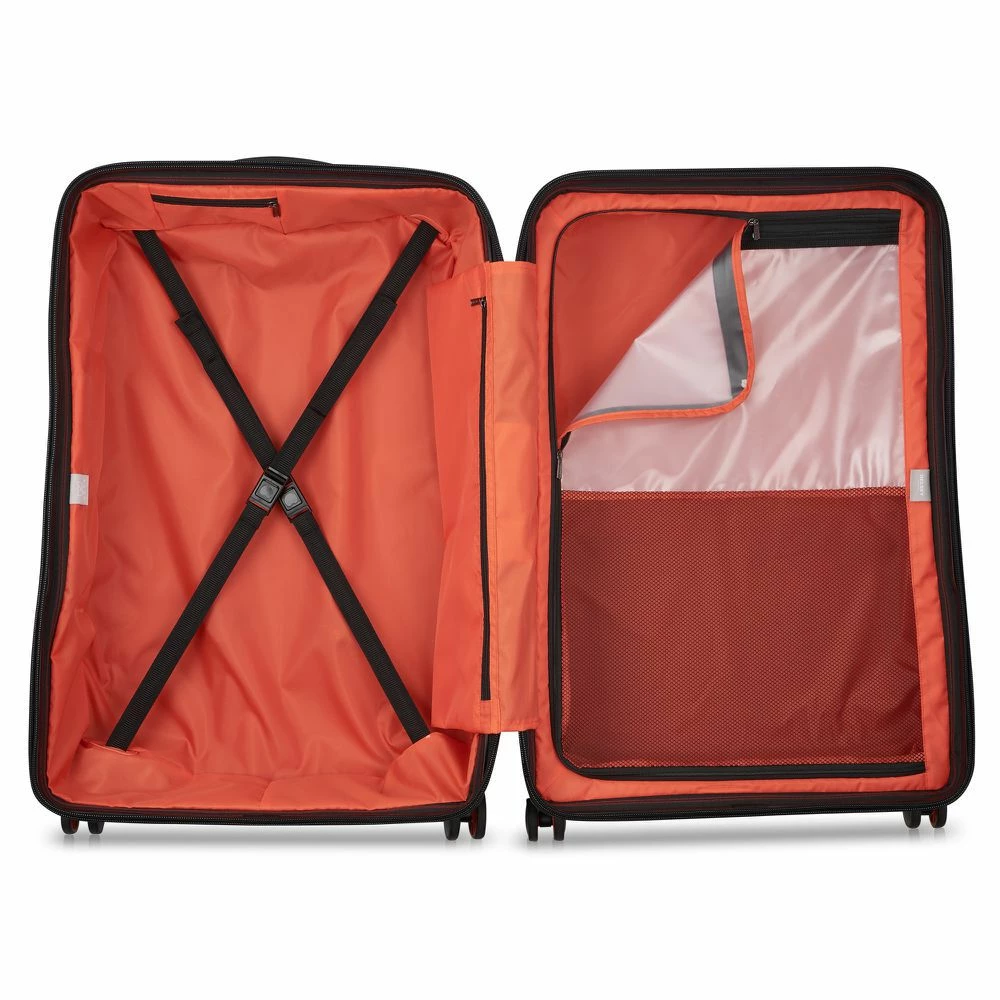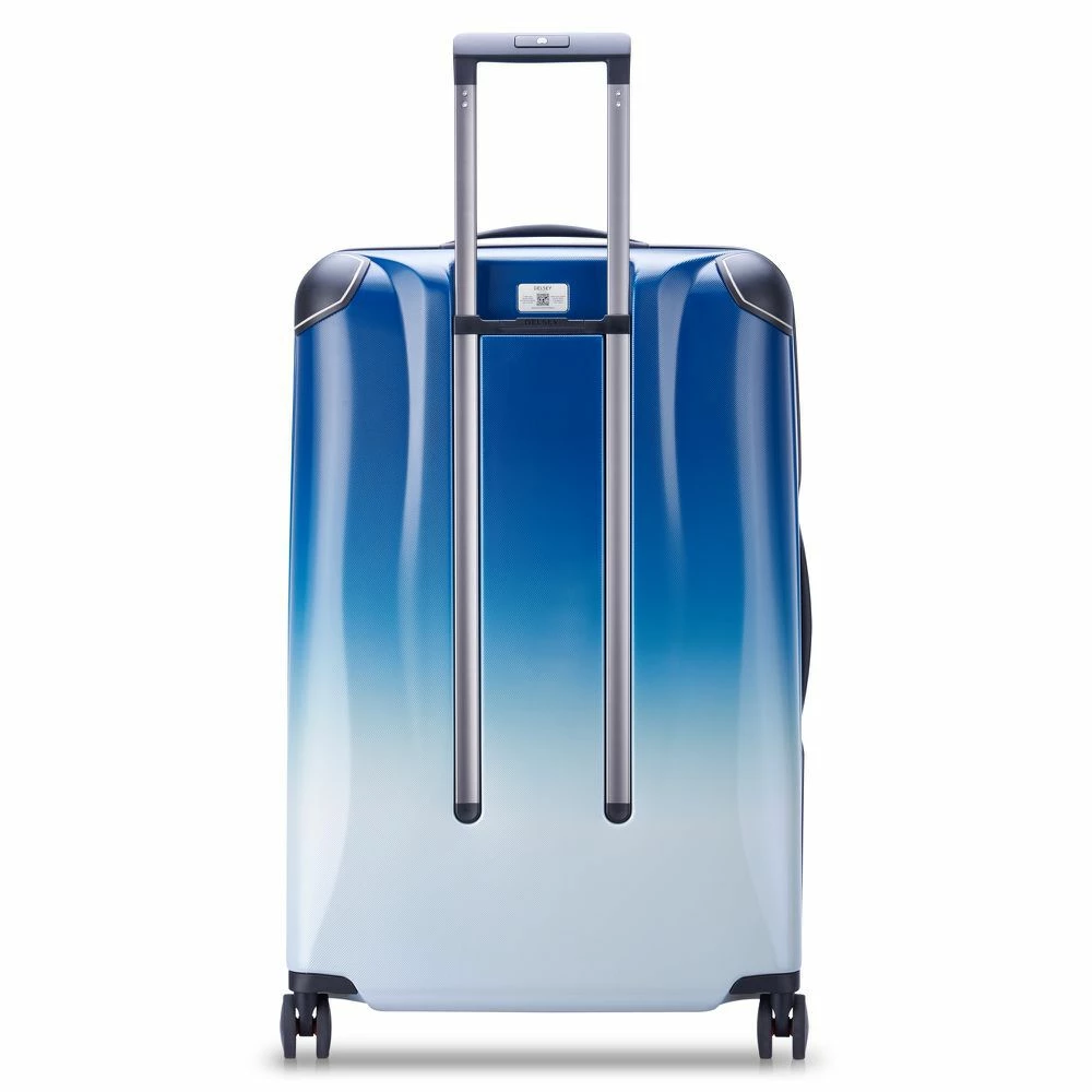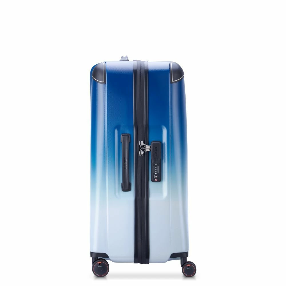 This large spinner is equipped with DELSEY dual-advanced wheel system. The telescopic handle locks into two positions and the back wheels are 20% larger to resist wear and tear, to accommodate both two or four wheel use . It also features three carry handles – on the top, on the side and at the bottom – providing maximum convenience when lifting a fully packed case.