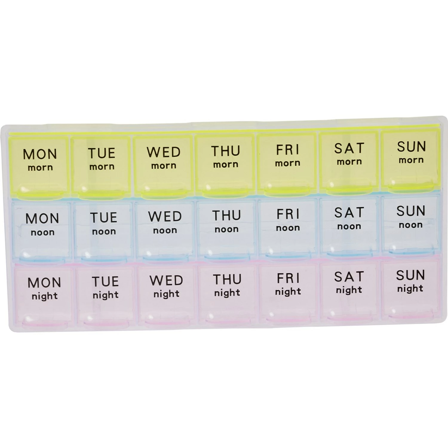 - Designed to store a week’s worth of medication with morning, noon and night slots each day