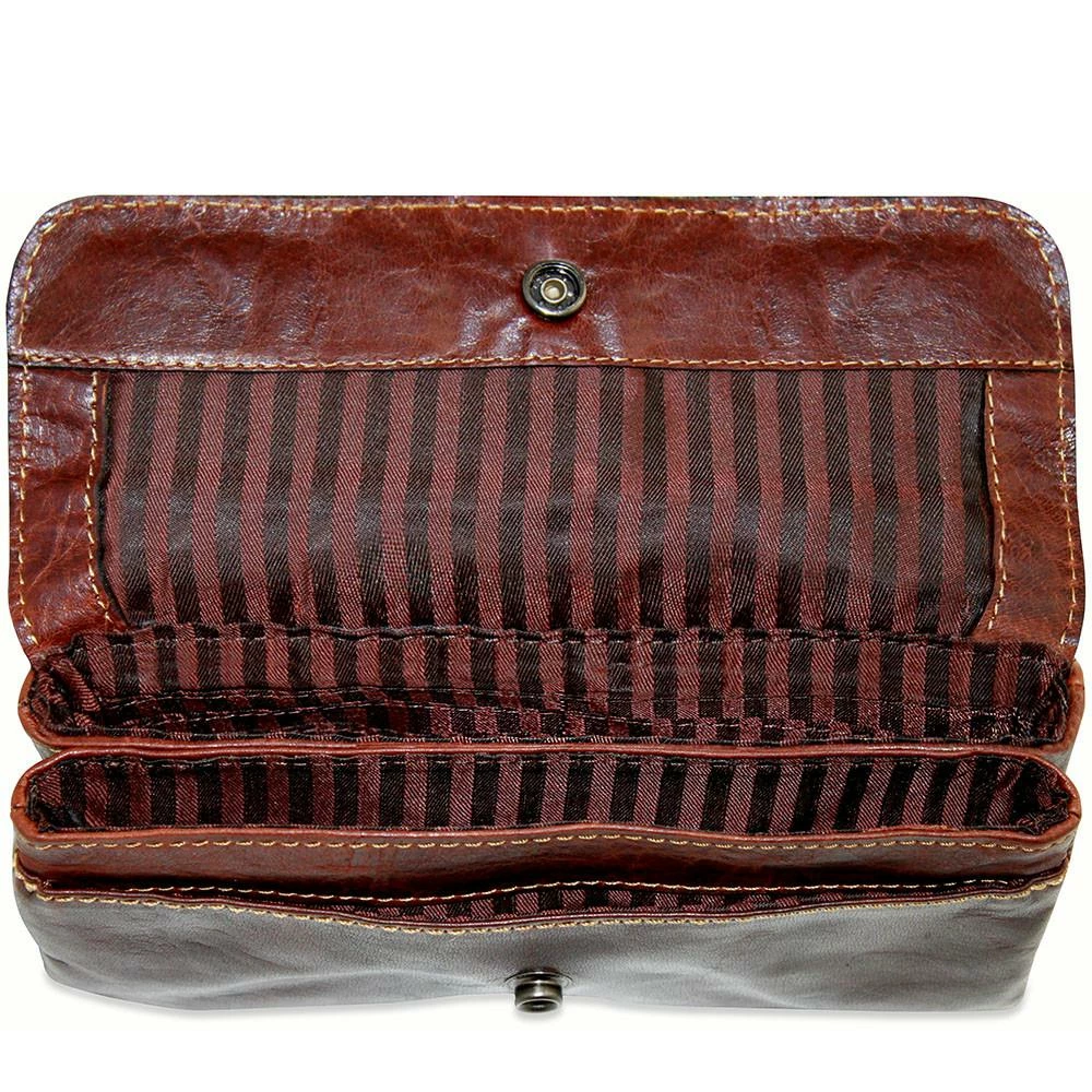 The Jack Georges Voyager Collection Wristlet Clutch is handmade from  vegetable re-tanned buffalo leather that builds a deep, rich patina as it ages. The bag has a top flap with magnetic closure and pockets to keep you organized. Under the flap, there is an open pocket on the face of the clutch. The main compartment is roomy and has 6 card slots to hold your credit cards, business cards, membership cards, and insurance cards.  A zippered back pocket can hold things that you would like to keep more secure.  A removable wrist  strap allows the bag to be used as a wristlet or a clutch.Â