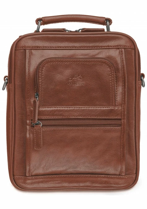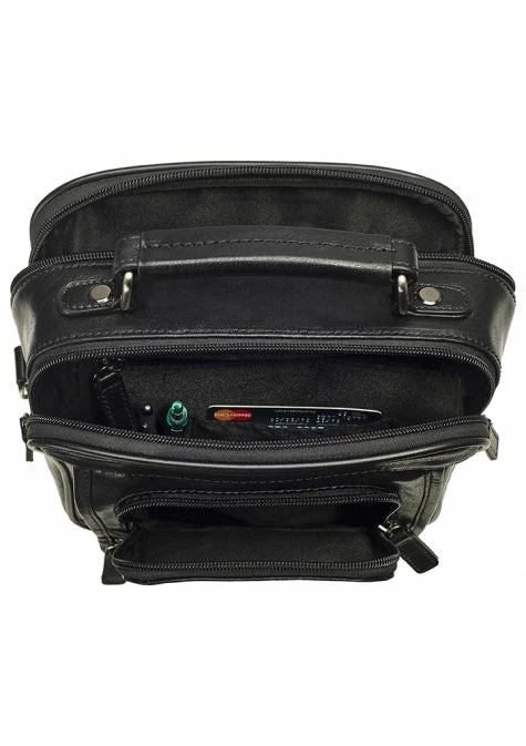 This unisex bag features a large zippered main compartment as well as multiple front zippered pockets. Includes a detachable shoulder strap.