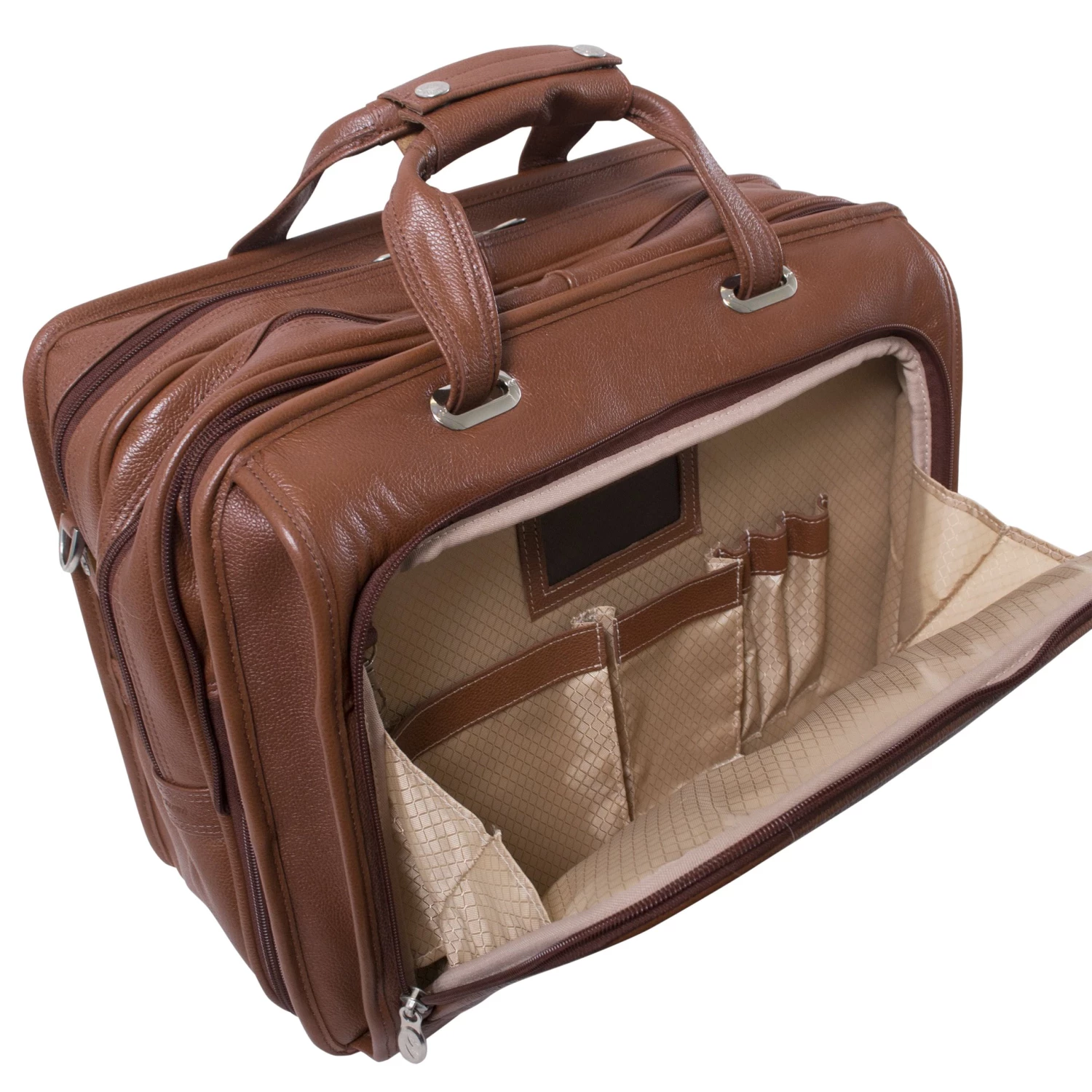 The McKlein USA West Town 15.6″ Leather Fly Through Checkpoint-Friendly Detachable-Wheeled Laptop Briefcase features a checkpoint-friendly design with secure, removable padded sleeve that fits most laptops up to 15.6″. Front zipper pockets for small accessories and front organizer pocket for media devices, cell phone, business cards, key holder and pens. Front compartment features a 3-file divider that expands 2″ for 30% more storage space. Smart Strap allows transport on extended handles of other rolling cases and luggage.