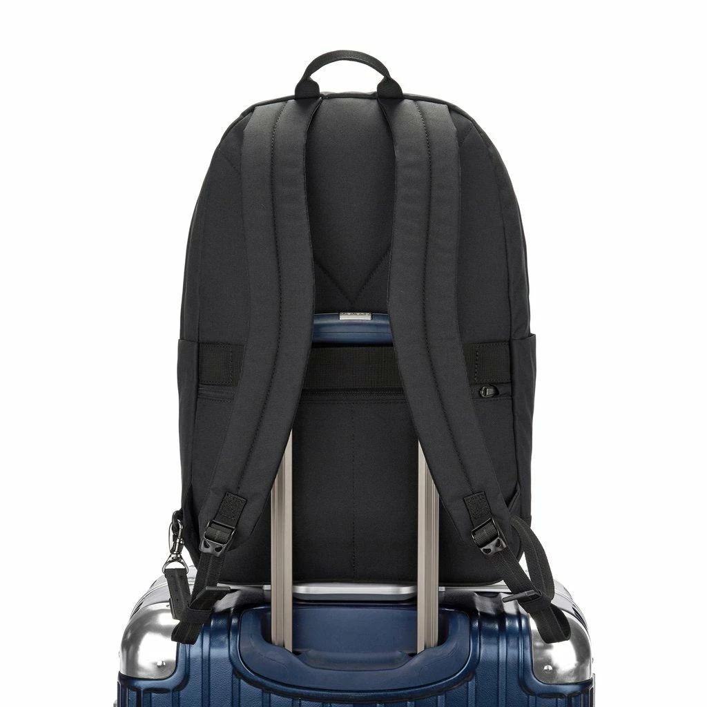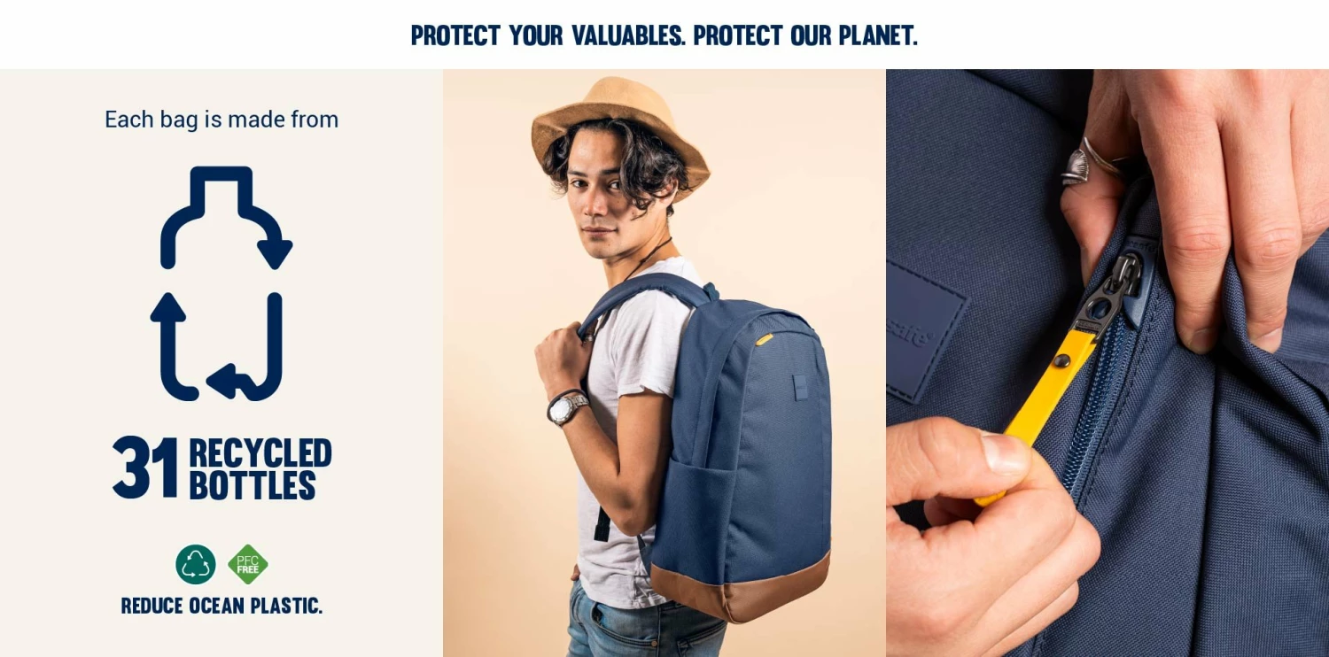 Spacious and practical, this durable anti-theft backpack is designed to fit all the essentials you need, including a padded compartment for your laptop, a luggage slip, and side pocket for a reusable water bottle. There’s even a hidden storage pocket for extra protection to keep your phone and wallet. This backpack features cut-resistant materials and straps, securable zippers, and an RFID blocking pocket. Our GO collection unlocks adventure and possibility with anti-theft security and effortless function. Made from 31 recycled plastic bottles
