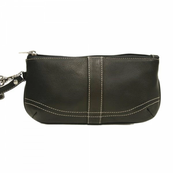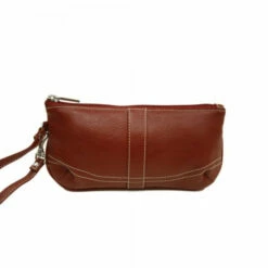Zippered opening to spacious compartment with a lined divider. Rear zip-pocket and a wrist strap for easy carrying.