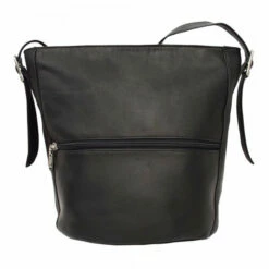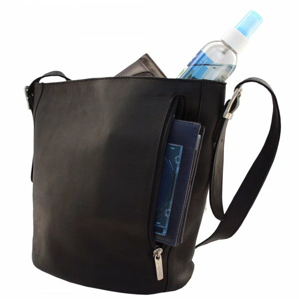 Single zipper opens to main compartment, magnetic snap opens to smaller compartment, front and back outside zip pockets, inside zip pockets, and long adjustable single strap.