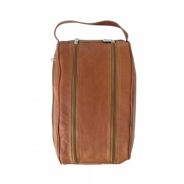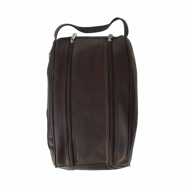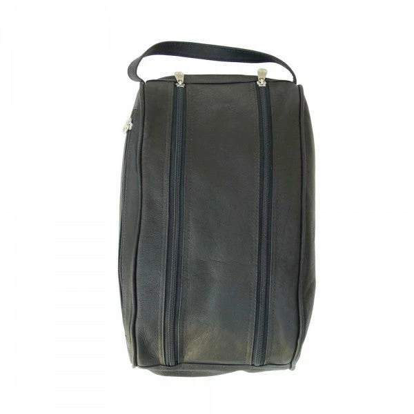 Features a double zipper which opens to two different compartments with water resistant lining for each shoe. Outside zippered pocket and easy carry handle.