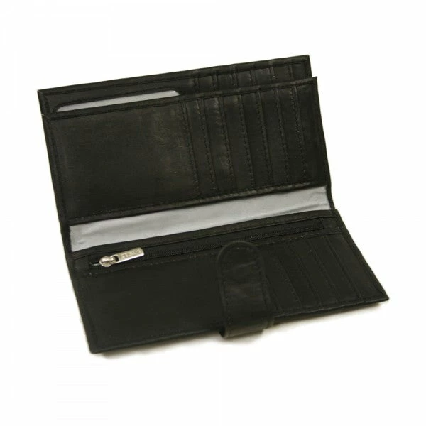 Snap opening to multiple card organizer, interior zip-pocket, window ID pocket, and five open pockets.