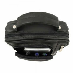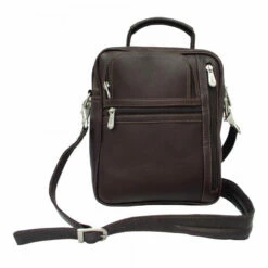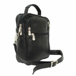 Top zip entry to main compartment. Front half-moon pocket complete with organizer, side vertical zip-pocket, front zip-pocket, and rear zip-pocket. Top handle and adjustable/detachable shoulder strap.