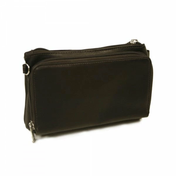 Front compartment zips around to reveal multiple card organizer, window ID pocket, currency slide pocket, and two open pockets. Top-zip opening to main compartment with interior zip-pocket. Rear open pocket with magnetic snap closure. Adjustable/detachable shoulder strap and detachable wrist strap.
