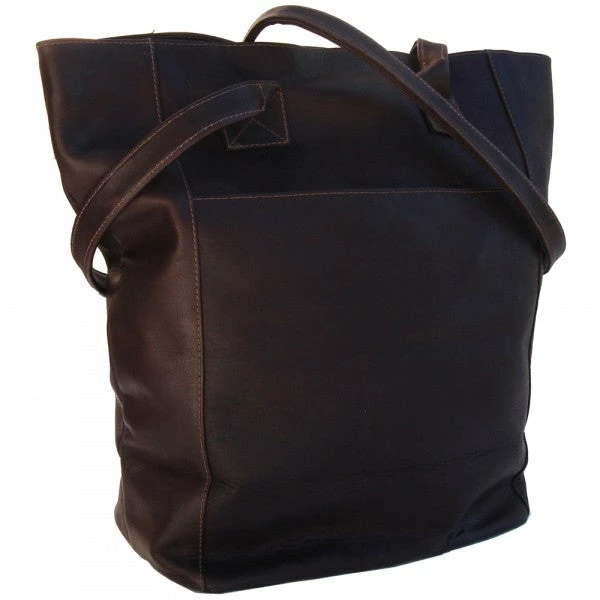 Magnetic snap closure to main compartment with interior zip-pocket. Large front open pocket, two rear open pockets, and long double shoulder straps.
