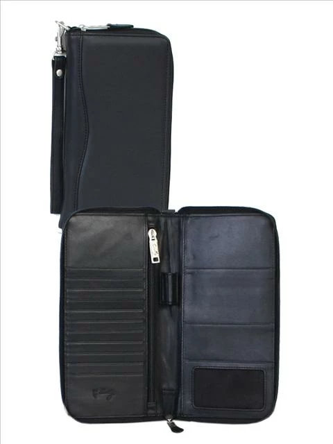 The Scully Leather Soft Plonge Travel Wallet in Black features a zip-around closure with removable wrist strap. The interior features multiple card pocks as well as two vertical and 2 horizontal pockets, providing room for all your credit, debit, and membership cards. An ID window and pen loop complete this highly functional and stylish wallet.