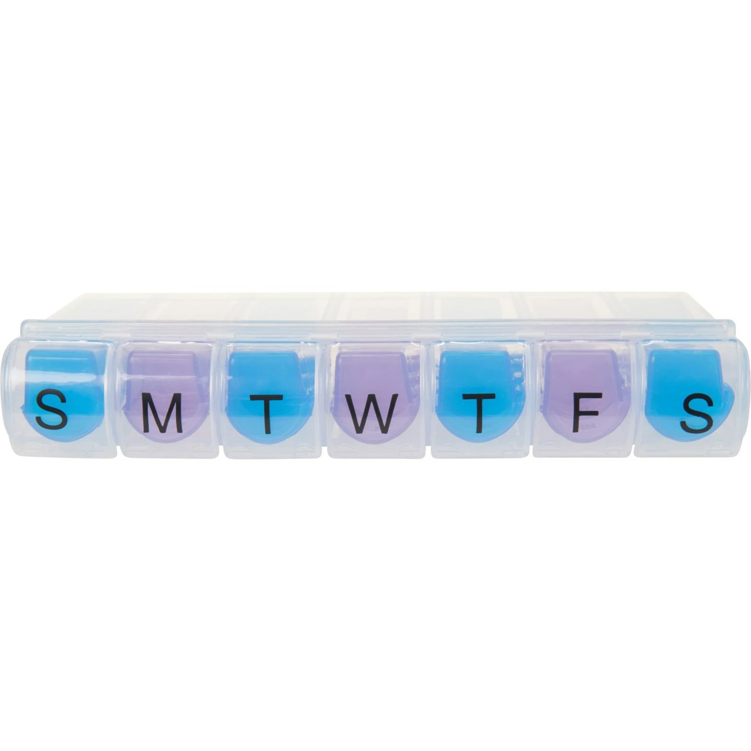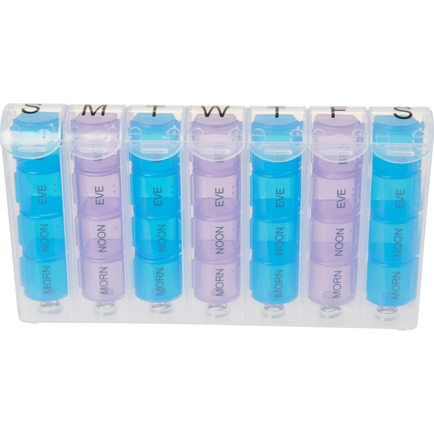 . With a color-code for each day of the week, Travelon’s Spring-Loaded 7-Day pill planner contains seven individual organizers with four divided compartments: morning, noon, evening and bed.